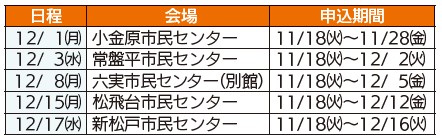 申込み:各申込期間内に、市ホームページ掲載の松戸市オンライン申請システムまたは電話でデジタル戦略課 講座受付専用ダイヤル【電話】047-710-8810(平日8時30分〜17時)へ