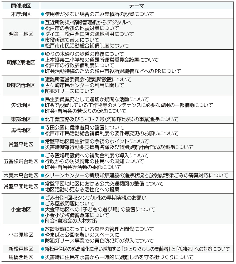 毎年各地区で地域の代表者である町会・自治会長が、地域の課題についてテーマを出し、市長やそのテーマの担当課と意見交換を行っています。