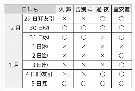 1月2日(金)から霊安室(ご遺体安置受け入れおよび面会)、4日(日)から式場通夜の利用が可能です。火葬業務は5日(月)から行います。