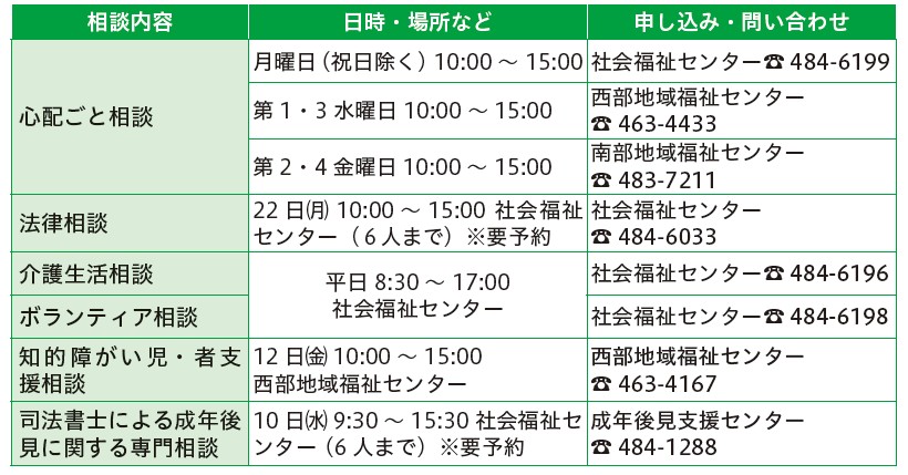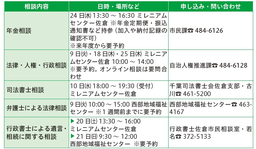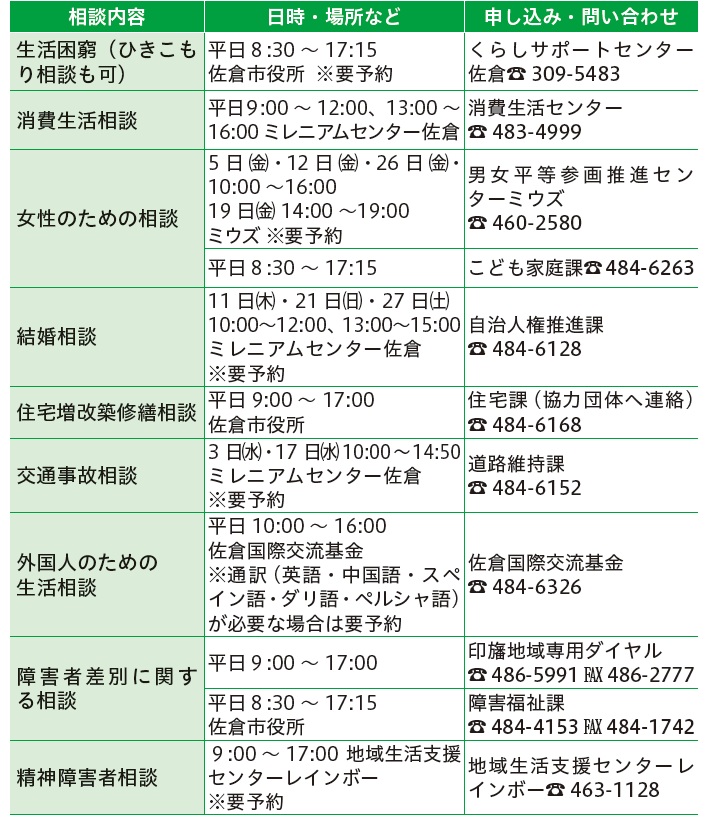 くらし 暮らしの相談 ※記載のないものは予約不要 18/30 前の記事 次の記事 発行日 : 2025年12月01日 自治体名 : 千葉県佐倉市 広報紙名 : こうほう佐倉 2025年12月1日号(1466号) ■生活に関する相談 ■子ども・育児・教育 ■仕事に関する相談 ※対象など詳細はお問い合わせください ■年金・法律など ■社会福祉協議会の福祉相談 Tweet シェアする 12月4日~10日は人権週間ですー「誰か」のことじゃない。ー 移動交番【12月の開設情報】
