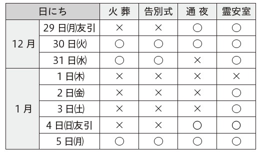 ・1月2日(金)から霊安室(ご遺体安置受け入れおよび面会)、4日(日)から式場通夜の利用が可能です。火葬業務は5日(月)から行います。
