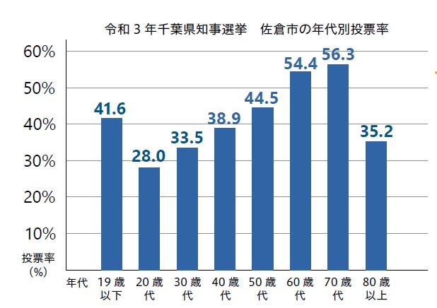 この数値は、令和3年3月の千葉県知事選挙の佐倉市民全体の投票率です。有権者の半数以上が投票を棄権しました。また、年代別の投票率をみると20歳代の投票率が最も低く、年齢が上がるにつれ、投票率も上昇しますが、80歳以上のかたの投票率が大幅に低くなっています。