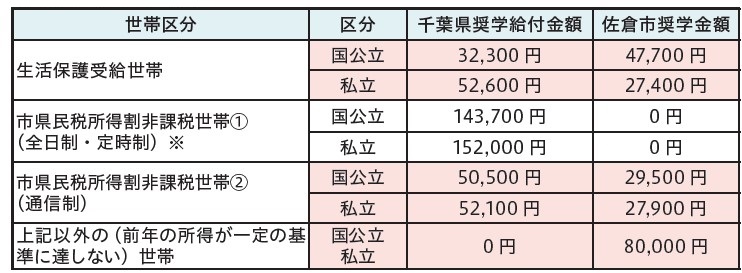※市県民税所得割非課税世帯で、対象者が全日制・定時制の高校生等の場合は、千葉県の給付金額が8万円を超えるため、佐倉市の奨学金は交付されません