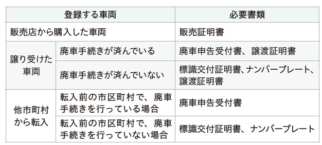 ※改造を伴う登録の場合、状況により必要書類が異なります。一度電話にてご確認のうえ、市民税課窓口で申請してください(郵送申請不可)