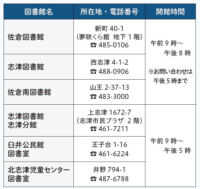 佐倉市内には3か所の図書館があり、図書室なども含めると、市内全館で約70万冊の本や雑誌などを所蔵しています。また、「移動図書館さくらおぐるま号」が市内を巡回しているほか、インターネットを利用して、電子書籍の貸出・返却が出来る「電子図書館」サービスなど、来館しなくても利用できるサービスも行っています。詳細は図書館ホームページからご覧ください。