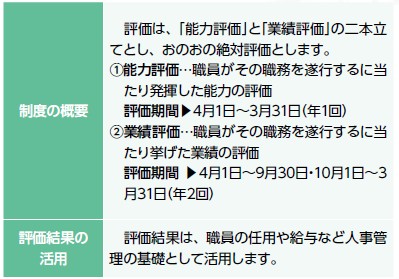 地方公務員法に基づき、職員の執務について定期的に人事評価を行っています。特別職を除く全ての職員が対象です。