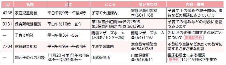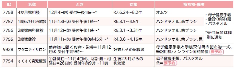 「子どもの健康カレンダー」【HP ID】1411でご確認ください。ふれあいセンター(健康増進課)、市役所(ロビー、子育て支援課)で配布しています。