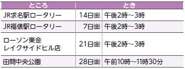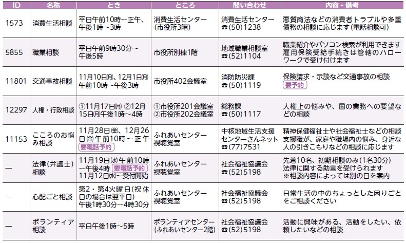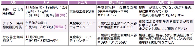 くらし 相談ガイド 34/39 前の記事 次の記事 発行日 : 2025年11月01日 自治体名 : 千葉県東金市 広報紙名 : 広報とうがね 2025年11月1日号 No.1375 ■公共機関などによる無料相談 ※平日…月~金曜日(祝休日、12月28日~1月3日を除く) ■民間団体による無料相談 詳しくは各団体へお問い合わせください。 ■今月の移動交番 開設予定 Tweet シェアする 休日当番医ガイド とうがね消費ナビ