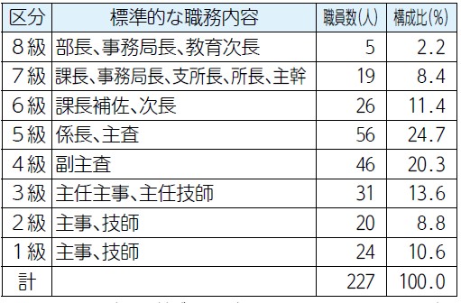 ※鴨川市の給与条例に基づく給料表の級区分による職員数です。標準的な職務内容とは、それぞれの級に該当する代表的な職務です。