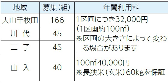 申し込み:1月31日(土)までに棚田倶楽部〔【電話】7099-9050・火曜日休館〕へ。申込用紙は同倶楽部のホームページからダウンロードできます。アンケートによる審査のうえ、2月中にオーナーを選定し、結果を本人にお知らせします