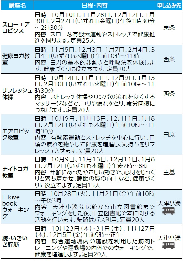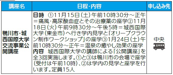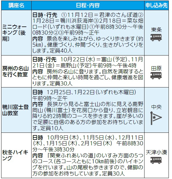2 「申し込み先」に記載している各公民館に申し込みをしてください。窓口・電話で受け付けます。電話で申し込みをした場合は、申し込み後、公民館にある募集要項や市ホームページにある「後期主催教室のお知らせ」から集合場所や持ち物などをご確認ください。希望者には葉書による案内を行います。(実費負担)