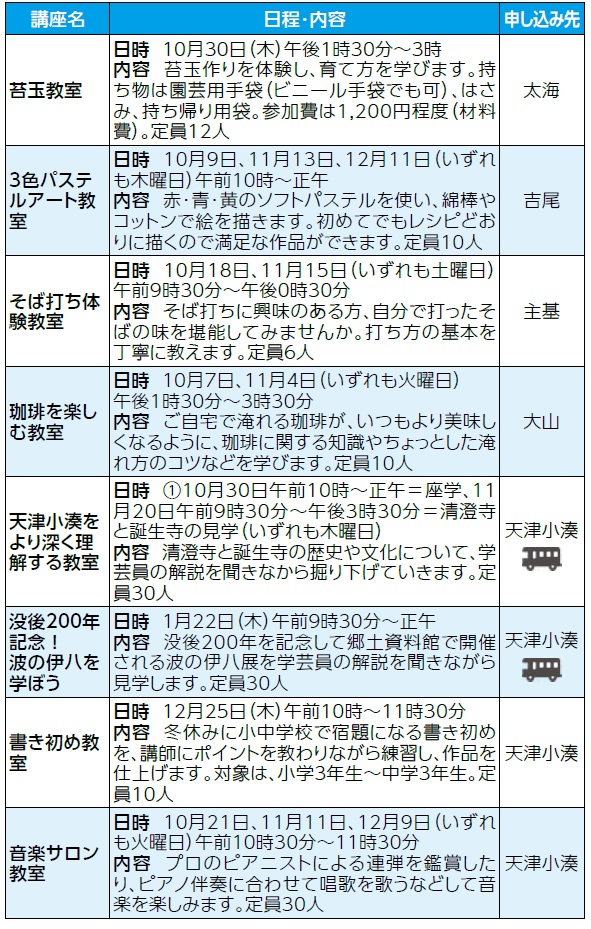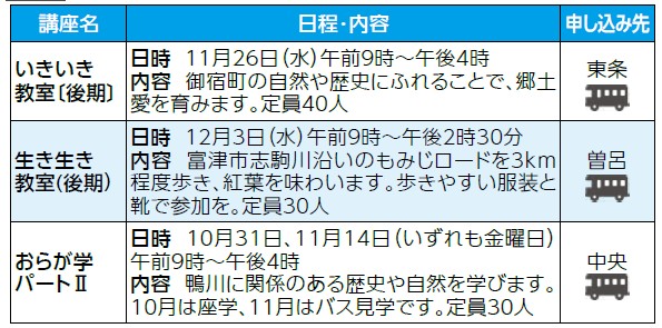・多くの方に参加いただくため、バス利用の館外教室の申し込みは、年間3教室以内とさせていただきます。ただし、「再募集」に申し込みをする場合は、年間3教室を超えても申し込みが可能です。