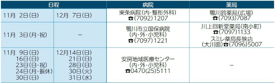 くらし 休日の救急医療機関・救急薬局〔11・12月〕 23/30 前の記事 次の記事 発行日 : 2025年11月01日 自治体名 : 千葉県鴨川市 広報紙名 : 広報かもがわ 2025年11月1日号 No.518 ■毎日24時間体制で受付(救急当番医ではありません) 亀田総合病院【電話】7092-2211(内・外・小児・産・耳鼻・眼科) Tweet シェアする けんこう広場 〔TOWN情報〕みんなの掲示板/イベント・催し物