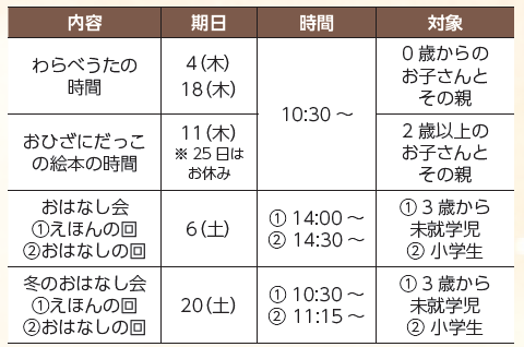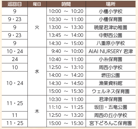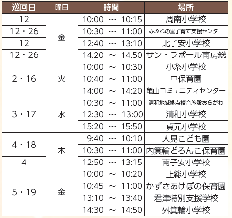 くらし LIBRARY INFORMATION 図書館だより 8/43 前の記事 次の記事 発行日 : 2025年12月01日 自治体名 : 千葉県君津市 広報紙名 : 広報きみつ 令和7年12月号 ●ひまわり号運行予定:きみぴょんがラッピングされた移動図書館です ■注意事項 ・祝日、悪天候の日、ステーションでの行事などの都合で運休することがあります ・年末年始(12/28~1/4)と冬休み期間の小学校、幼稚園、君津特別支援学校の巡回は運休します ■12月 中央図書館の催し 問合せ:中央図書館 【電話】52-4646 Tweet シェアする 体組成測定会 一日体験図書館員
