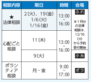 注意事項:法律相談は、継続して受けることができません。(年1回程度)