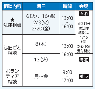 注意事項:法律相談は、継続して受けることができません。(年1回程度)
