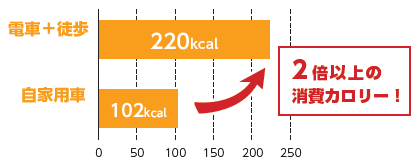 電車は歩く場面も多く、同じ移動距離でも消費カロリーは2倍以上になります。(出典:日本モビリティ・マネジメント会議)