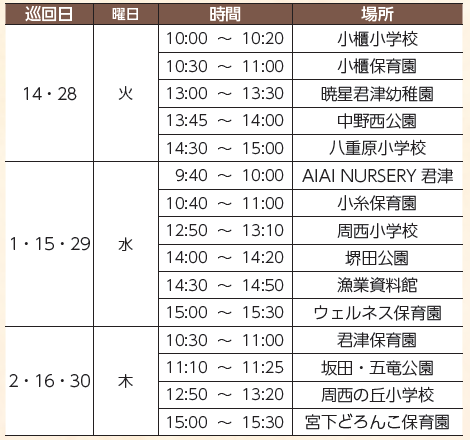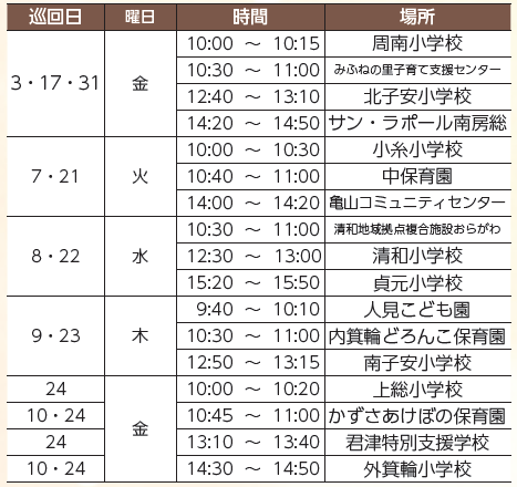 ●ひまわり号運行予定:きみぴょんがラッピングされた移動図書館です