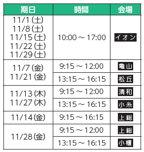 日時:11月9日(日)、23日(日)午前9時から正午、午後1時から4時30分※受付は午前9時から午後4時までです。交付を希望する方は事前に予約してください