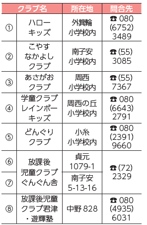 仕事などで昼間の家庭に保護者がいない小学生のために、遊びや生活の場を提供して、健全な育成を行うための施設です。市内のクラブは、保護者会や社会福祉法人などが設置・運営しているため、雇用条件などが異なります。