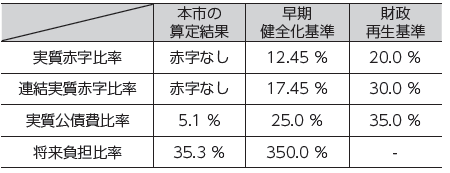 令和6年度決算に基づき算定したところ、健全化判断比率は、いずれの指標についても早期健全化基準を下回っており、健全段階でした。また、資金不足比率は、該当ありませんでした。