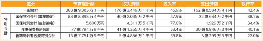 当初予算額358億7,000万円に対し、5回の補正予算や令和6年度に終了しなかった事業を引き続き行うための予算(繰越明許費など)を合わせ、予算額は、383億9,383万1千円となりました。この予算額に対し収入率は45.9%で、昨年同時期と比較すると0.3ポイント増となっています。また、執行率は42.4%で、昨年同時期と比較すると2.5ポイント増となっています。