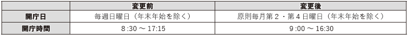 職員の働き方改革の推進や行政サービスのオンライン手続の普及に伴い、日曜開庁サービスの開庁日および開庁時間を変更します。なお、取り扱い業務については、変更はありません。