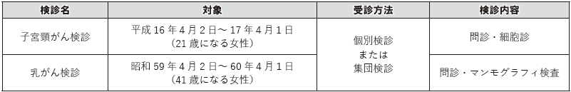 特定の年齢に達した方は、子宮頸がん検診・乳がん検診を無料で受けることができます。