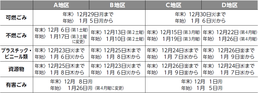年末は12月26日(金)まで収集します。粗大ごみ収集の申し込みは、年内の収集が可能な件数に達し次第、受付終了します。年始は1月5日(月)から電話受付を開始します。