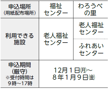 福祉センターとわろうべの里では、8年度(8年4月~9年3月)に利用を希望する定期利用団体の登録受付を行います。