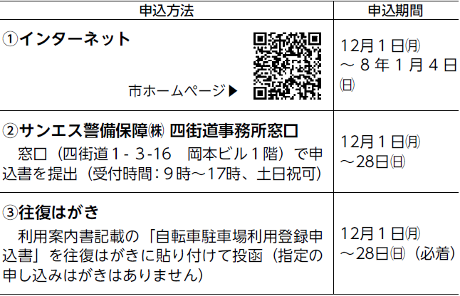 ※申込案内書は、自転車等駐車場(管理棟がある施設のみ)、市役所総合受付、四街道事務所で配布します
