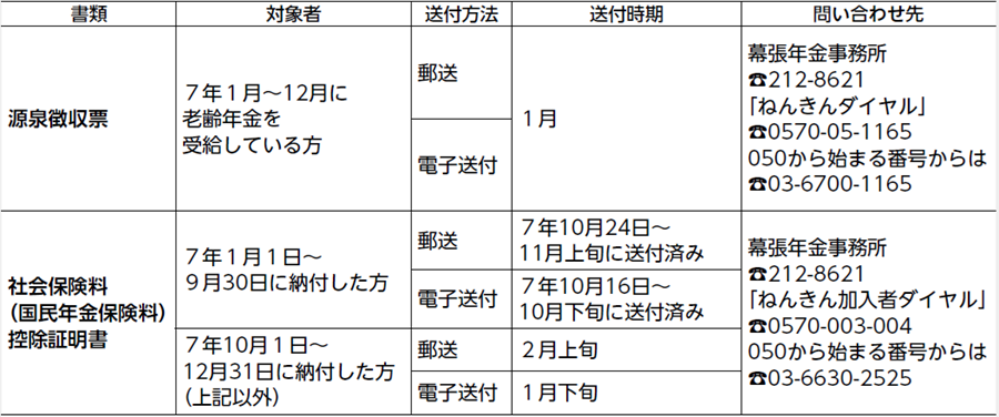 A:「源泉徴収票」や「社会保険料(国民年金保険料)控除証明書」が必要になります。下記のとおり日本年金機構から発送されます。
