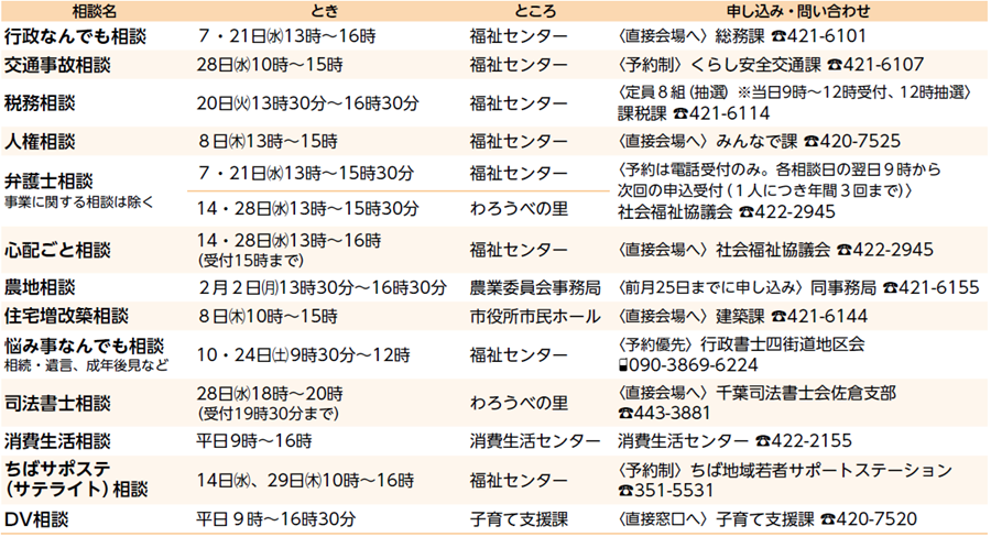 くらし 困ったときの相談窓口〈1月〉 10/17 前の記事 次の記事 記事を読み上げる 発行日 : 2026年01月01日 自治体名 : 千葉県四街道市 広報紙名 : 市政だより四街道 令和8年1月1日号 お気軽にご相談ください ■水道緊急修理受付 宅内漏水はお客さまの負担が伴う場合があります 市指定管工事業協同組合 【電話】080-5073-2713 ■防災行政無線情報提供サービス 防災行政無線の情報をご家庭の電話で確認することができます 【電話】0120-972-302 Tweet シェアする みんなのひろば 市税などの納期