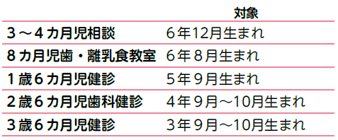 内容:妊娠中の栄養の話、離乳食作り体験、歯周病と歯みがきのポイントの話、歯垢の染め出し、ブラッシング実習持ち物…母子健康手帳、筆記用具、使用中の歯ブラシ
