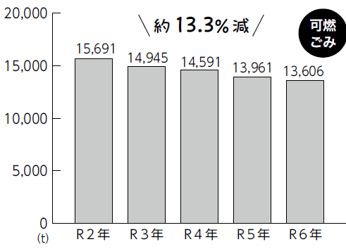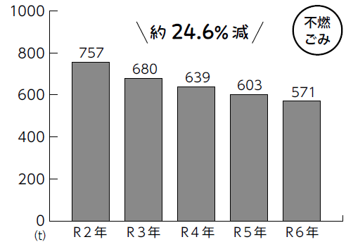 ごみ処理手数料制度を導入してから5年で、皆さんのご家庭から出た可燃ごみの量は約13・3%減少し、不燃ごみの量は約24・6%減少しました。
