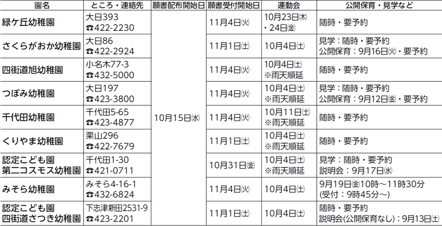※詳細は各園に直接お問い合わせください