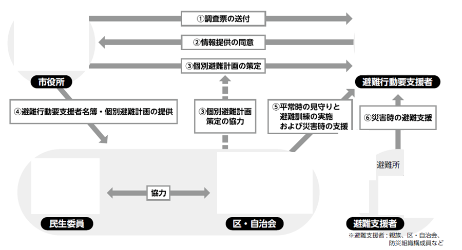 災害が起きたときに避難支援を必要とする方に対して、平常時から、避難支援等関係者(民生委員・児童委員、社会福祉協議会、地域包括支援センター、区・自治会、自主防災組織、消防団、警察署など)が協力し、災害時の備えを行っていく事業です。