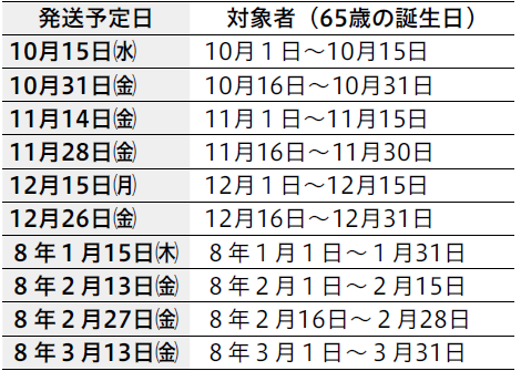 発送予定日:9月30日時点で65歳以上の方への発送予定日は9月12日(金)です。10月以降に65歳の誕生日を迎える方は下記発送予定日に郵送します。