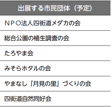 市では、豊かな自然を守り、次の世代へ引き継ぐための取り組みを市民団体と協働で進めています。このコーナーでは、市内の生きものに関する展示に加え、それぞれの団体の活動内容や魅力に触れることができる、市内の生きものや自然に関する展示を行います。