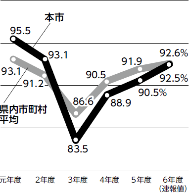 本年度は、扶助費や人件費の増加により92.5%となり、前年度と比べて2.0ポイント増となりました。高齢化の進行・子育て支援・公共施設の老朽化など、多様化する課題に対応し、事業の効率的・効果的推進と、持続可能な財政基盤構築の両立に向けた取り組みを継続する必要があります。