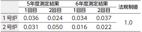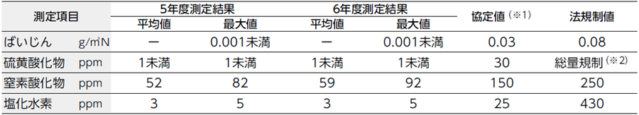 6年度の排ガス測定は、1号炉、2号炉とも各6回の測定を行い、平均値と最大値を算出しています。その結果、全ての測定項目で排出基準値を下回りました(表5)。