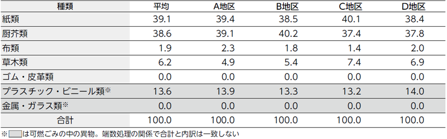 可燃ごみの分別状況を、A~Dの地区ごとに調査しています。その結果、全地区の生ごみ(湿)ベース平均で、可燃ごみの中にプラスチック・ビニール類が13・6%混入していました(表4)。