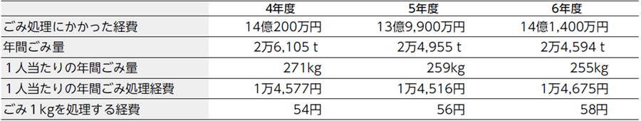 ごみを処理するためには、ごみを集める費用、集めたごみを焼却・破砕する費用、焼却で生じた灰を処分する費用などがかかります。これらの処理を行うために、6年度は約14億1400万円かかりました(表3)。