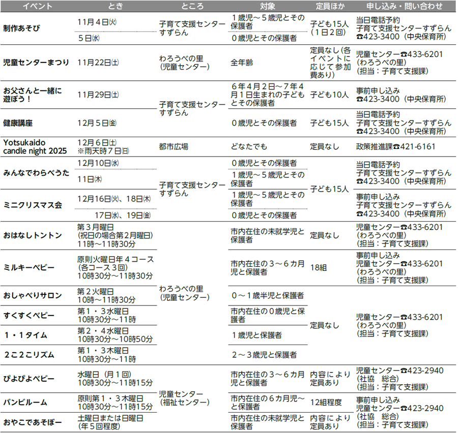 ※この表に記載がなくても、開催されるイベントがありますので、市のホームページなどもあわせてご覧ください