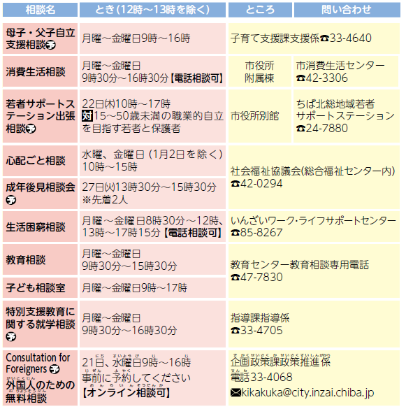 くらし 各種無料相談1月 61/65 前の記事 次の記事 発行日 : 2025年12月20日 自治体名 : 千葉県印西市 広報紙名 : 広報いんざい 令和8年1月号 ※祝日の相談はありません ※階段の昇降に支障のある人は予約時に申し出てください Tweet シェアする 高齢者就労支援センター 高齢者のための企業説明会・講習会(無料) 印西市市制施行30周年記念 ロゴマーク・キャッチフレーズが決定