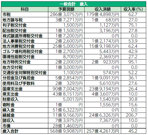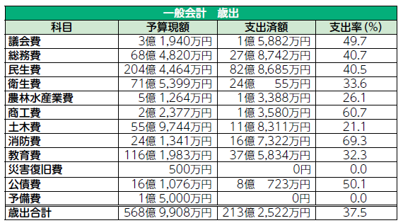 令和7年度一般会計当初予算額は570億6,000万円でしたが、その後3回の補正が行われ、9月末現在の予算額は568億9,908万円(うち前年度からの繰越分が8億1,248万円)です。前年同期比4.2%の増となりました。