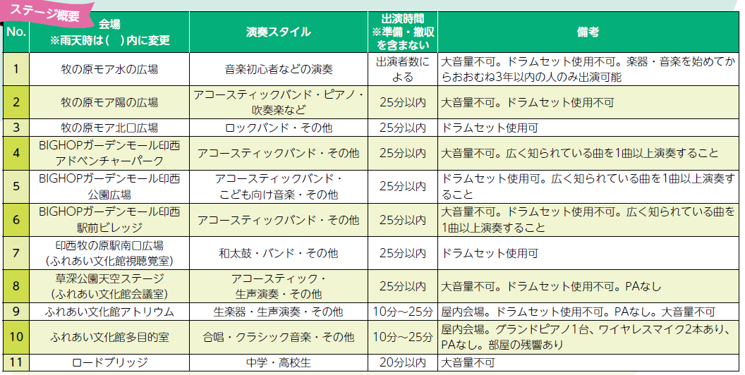 ※詳細は募集要項などを参照。アンプ類、ドラムセット、楽器スタンド、シールド、譜面台などは出演者が用意。備考欄の内容は予告なく変更になることがあります