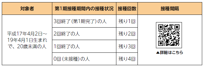 日本脳炎予防接種は、積極的な勧奨を差し控えた時期があり、接種機会を逃した人がいます。そのため、現在特例措置で20歳の誕生日の前日まで無料で接種をすることができます。特例措置対象者は、下記の表を確認し接種しましょう。