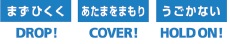 地震の際の安全確保行動「1-2-3」を身につける訓練です。 地震が発生したら、その場で「まずひくく(DROP)・あたまをまもり(COVER)・うごかない(HOLDON)」を1分間行ってください。