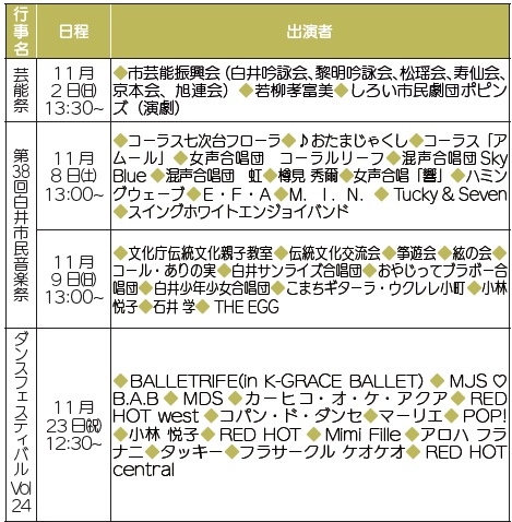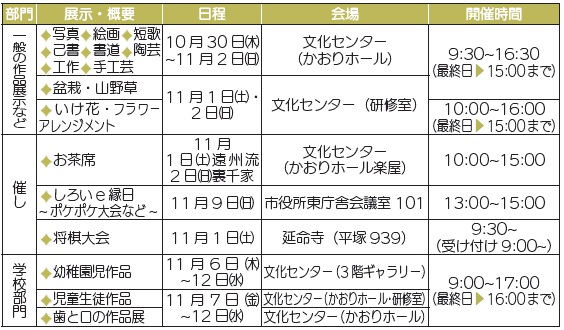 市民の皆さんが日頃取り組んでいる芸術・文化活動の成果を発表する市民文化祭が始まります。一般作品の展示やダンスフェスティバルまで、展示や舞台発表など多彩な催しが繰り広げられます。友達や家族と一緒に見学や催しに参加してみませんか。日程や催しの詳細は表のとおりです。